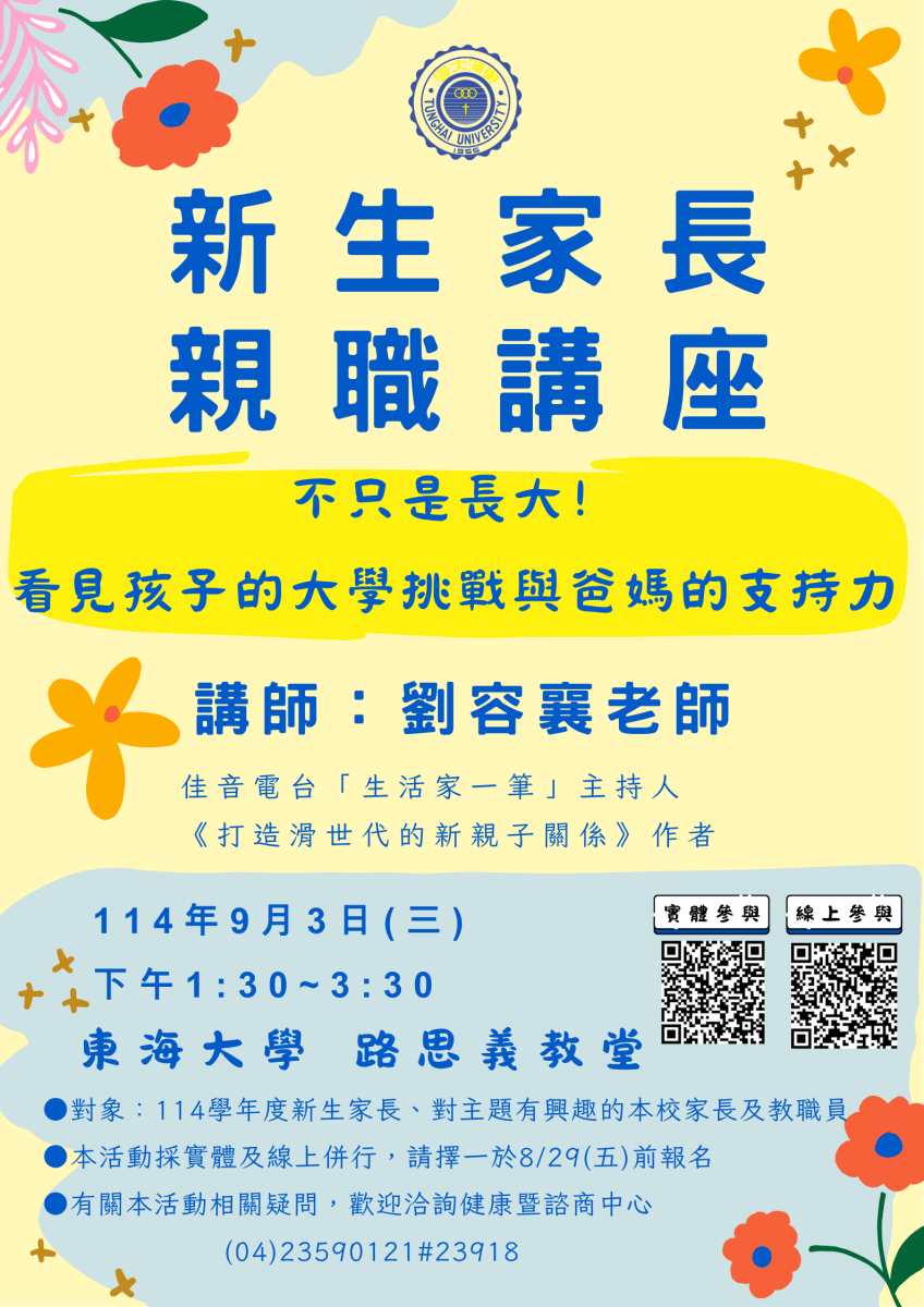 歡迎參加「新生家長親職講座」,我們邀請《生活家一筆》主持人劉容襄老師,與您一同看見孩子的蛻變歷程與成長挑戰,思索身為父母的新角色與支持方式。